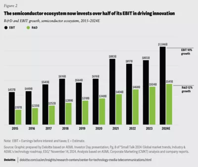 Further, driving innovation in the industry is not cheap. In 2015, the overall chip industry average for spending on research and development was 45% of its earnings before interest and taxes (EBIT), but by 2024, it was an estimated 52% of the same.19 R&D seems to be growing at a 12% CAGR, white EBIT is only growing at 10% (figure 2).20