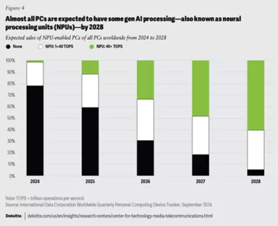 Personal computers: Sales of gen AI–powered PCs are predicted to comprise half of all PCs in 2025,26 with some forecasts suggesting that almost all PCs will have at least some onboard gen AI processing—also known as neural processing units (NPUs)—by 2028 (figure 4).27 These NPU-powered machines are expected to command a price premium of 10% to 15%,28 but it’s important to note that not all gen AI PCs are equal. There’s a dividing line at the 40 TOPS (trillion operations per second) level, following a recommendation from major PC ecosystem companies that only computers with more than 40 TOPS be considered true AI-enabled PCs.29 As at the time of writing, some buyers are cautious about these new PCs, either unwilling to pay the premium, or waiting until more powerful gen AI NPUs are introduced in the second half of 2025.30