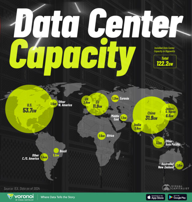 Northern Virginia is by far the largest market, with 5.6 gigawatts of total capacity compared with 1.5 gigawatts in the second-largest area, Dallas-Fort Worth, according to JLL. One gigawatt can power 750,000 to 1 million homes.