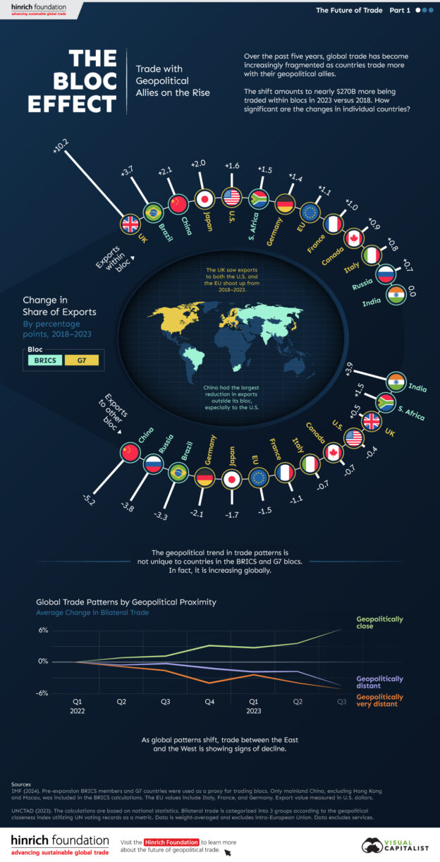 This graphic from The Hinrich Foundation, the first in a three-part series covering the future of trade, provides visual context to the growing divide in trade in G7 and pre-expansion BRICS countries, which are used as proxies for geopolitical blocs.