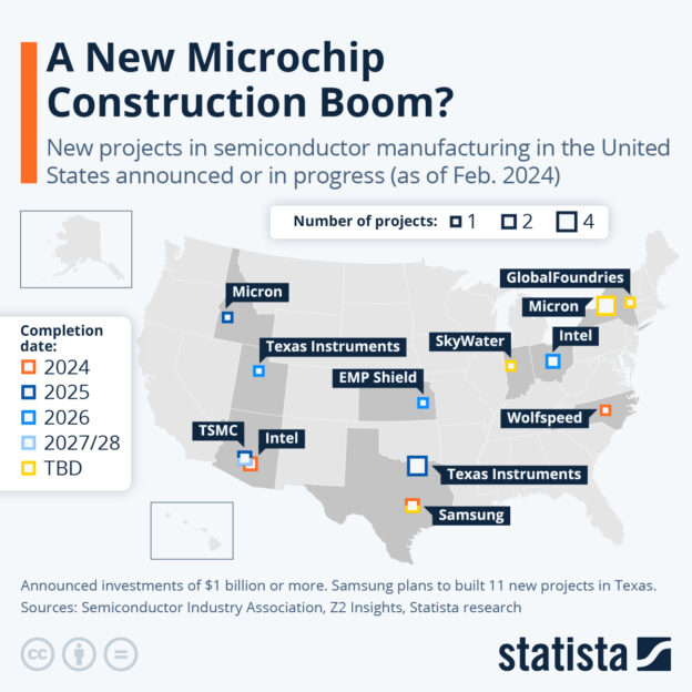 A look at the map of major semiconductor manufacturing projects in the U.S. as of early 2024 shows that other than Intel’s twin locations near Phoenix, Samsung is scheduled to open a facility on the outskirts of Austin, Texas, this year still. The projects are expected to cost between $17.3 billion and $20 billion and were started in 2021 and early 2022, respectively. The first TSMC factory as well as a facility in Boise, Idaho, by U.S. chipmaker Micron are scheduled to be finished next year. This also applies to four new fabs – wafer fabrication plants – in North Texas by legacy producer Texas Instruments. The company that is also expected to open another location in Utah in two years’ time will be producing analog and embedded 300-mm semiconductors at both locations that are used for personal computer and other memory applications.